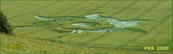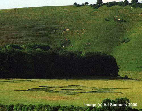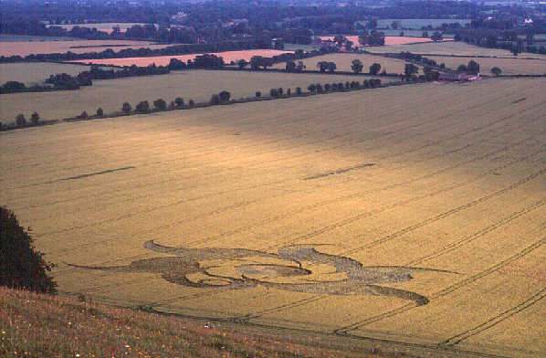 From the hillside, this wonderful design seems to be unfinished. The nearest blade towards the hill is incomplete, but has started to be marked out. There is also a part of the flattened inner section of crop, which stills appears to be standing. However, this beautiful formation has not been spoiled by its missing elements, or by its positioning close to the hill. Its location is part of the historical characteristic of the phenomenon, when many events appeared on the lee of a hillside.