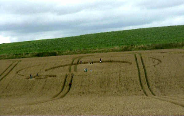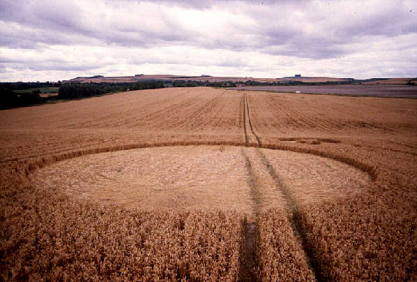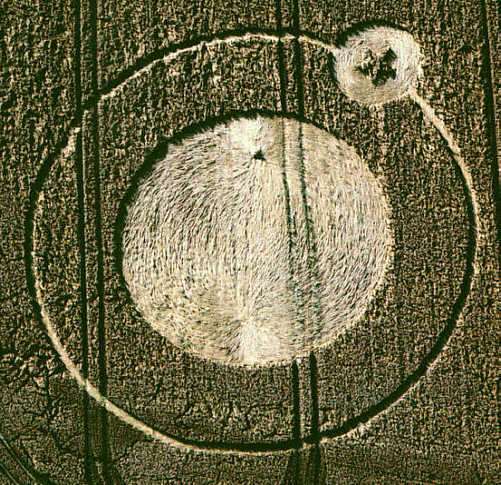 MOIRÉ PATTERN RETURNS This rather favorable ringed circle, just outside of the small village of Horton, was the start of a change of detailing by the Circlemakers, but it also incorporated other features, which has been seen before! Click on thumbnails to enlarge The formation was positioned at the very top of the Knoll, facing towards Horton. It’s the first time to have an event in this particular field, which has been monitored every morning by our researchers who actually live in the village. They were astonished to find the formation so close to their home, but what was even more amazing was what they were greeted with when they finally entered the formation. ‘two directional floor lay that followed the circular pattern to meet at an exquisite wheat sheaf center.’ The Avebury Trusloe formation, known to us as the Moiré, has captured people’s imagination with its shear breathtaking design. The pattern within this formation has been mirrored in the floor lay at the Knoll. At the very top of the main circle, we have a two directional floor lay that followed the circular pattern to meet at an exquisite wheat sheaf center. The type of feature has never been seen before (or at the time this formation formed). This wonderful new feature was so compacted into a mound of wheat, that if you sat on it, you wouldn’t have destroyed the detail. A number of animal tracks were also laid underneath the floor pattern, but they were also evident surrounding the circle itself. Another oddity, was the connected circle on the outer ring. |