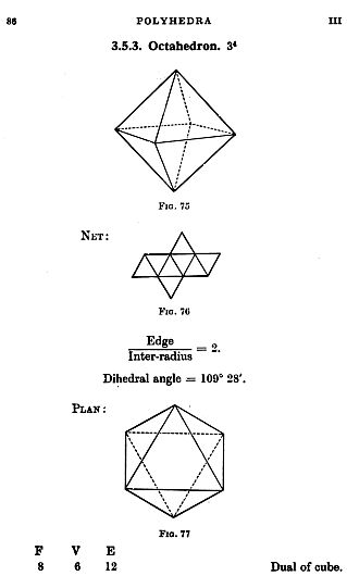 an OCTAHEDRON. This is one of The Five Regular Platonic Polyhedra of which the Tetrahedron, Cube, Dodecahedron and Icosahedron also belong. Interestingly the Tetrahedron, Cube and Octahedron occur naturally in the form of certain crystals. It is possible to make this solid from the NET shown in the attached illustration. All you have to do is draw the diagram, as shown in Fig.76, on thin card, cut it out and score lightly along the remaining lines between the triangles with a sharp knife. It is then a simple matter to fold each triangle along the score lines and join each edge together with small tabs of sticky tape to form the model. Good luck with sticking the last face in place. David Tarr. |