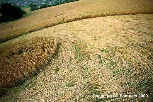 There is a large main circle about 120ft diameter with an offset standing centre. This circle has by far the best flow pattern of the whole formation, with complex swirls surrounding the standing area. Scattered around the main circle are about 11 other circles of varying sizes all joined by narrow pathways which run under the lay of the flattened crop within the circles themselves. 6 of these circles are arranged in a roughly straight line running across the slope, while the other 5 follow a curving path down the hill, the lower ones in particular lying on such a steep incline it is difficult to stand up in them. All these circles appear to be swirled clockwise, and in general are quite neat (allowing for the state of the crop), although some of the centres are a little untidy. Overall the layout of the formation gives the impression of having been created 'on the fly' rather than being a predetermined design. A pleasing effort, though, especially compared with the amateurish rubbish which has appeared in this area in previous years.