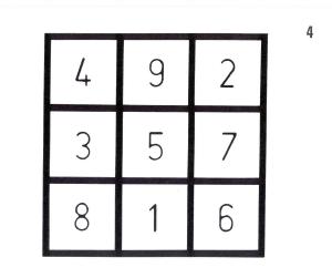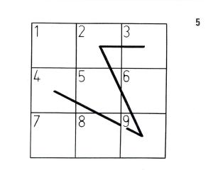 This square consists of 9 numbers seemingly placed at random throughout. In order to unravel a geometric pattern we need to draw a grid ourselves, that's numbered in horizontal sequence 1 to 9. Working horizontally across the ‘magic square’, line by line, (4, 9, 2, 3 etc), we then find the square that corresponds in number in our grid. By drawing a line from the centre of that square to the next indicated, we slowly find a pattern emerging (figure 5).