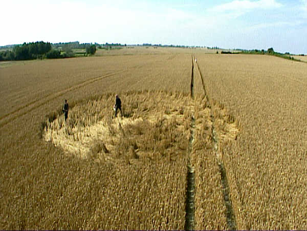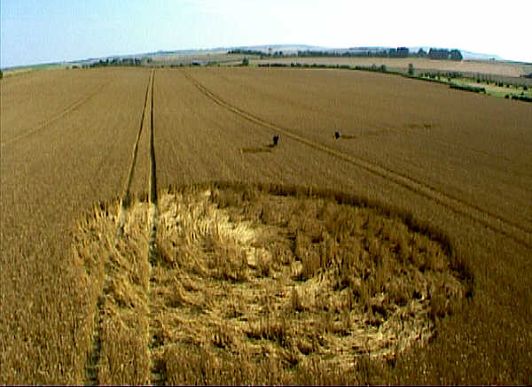 lot of skill to carefully place your footing between growing crop’ The other 13 circles, situated in a ragged tail placed in between tramlines, were all very much smaller in size, to the head circle. These smaller circles were however fairly neat in appearance, but there was no evidence of any entry into these small grapeshot circles. Located almost exactly halfway between two tramlines, they remained remote to the onlooker. It took a lot of skill to carefully place your footing between growing crop. The most interesting cluster of circles, was what everyone is calling the ‘Tail’ on the formation. There were seven circles all placed side by side (joining) to create an arrowhead appearance. Every circle was flowing in a clockwise rotation with small standing tufts in the middle, but they weren’t the neatest of circles I have seen. However, we all know at this time of year, the crop is extremely ripe, which can create messy looking floor patterns. THE BEAST OF AVEBURY This may not be crop circle related, but I felt I had to tell everyone what I saw. While I was walking up the rather rough track towards the field in question, I had to walk along the side of the field, as the track led up to Windmill Hill. As I entered the clearing, I spotted what looked like a small cat. It was slightly larger than a normal domestic cat, with white tufts on the top of its ears. It looked at me, and then sprinted away up the track, and then stopped again to turn around. It then carried on towards Windmill Hill, but I finally lost sight of it within the hedgerow. There was no way this was a normal domestic cat, but perhaps some wild creature, of the cat family? Very strange sighting, but this is not the first time a creature of this type has been seen! Just the other night Frank Laumen was describing his experience as he drove down the Avebury Avenue towards the A4. He was driving past the Stones on his right, when suddenly this huge cat ran out from the avenue into a track on the other side. It was the size of a panther of Jaguar, but he swears it was certainly no dog, or domestic cat. So there we have it, perhaps the Avebury area, has other mysteries lurking in the fields? Field Report and Images Stuart Dike Copyright 2000 |
