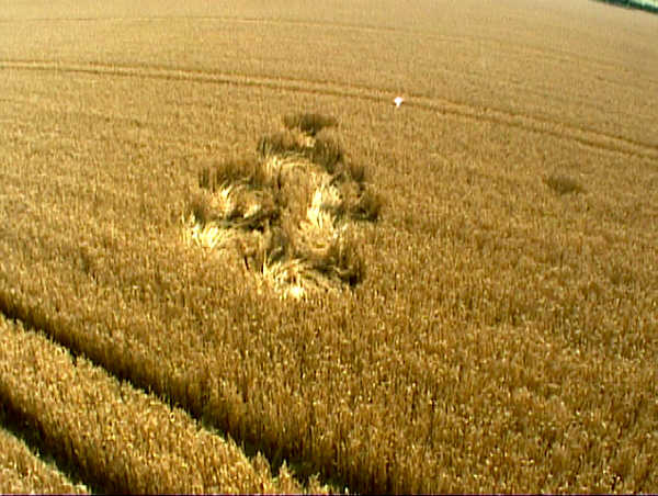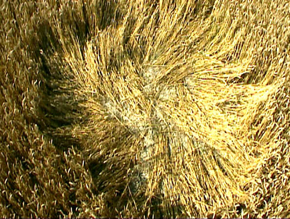 LINE OF CIRCLES DELIGHT AT WINDMILL Click on thumbnail to enlarge. The ancient settlement of Windmill Hill, has been a major target for the Circlemakers in 2000, and has used the same field as the 1996 Julia Set (one of the most celebrated formations) which captured peoples imagination. Click on thumbnail to enlarge. Windmill Hill 1996 These rather unimpressive sets of 14 circles (from the air) are extremely interesting from the ground. ‘On closer inspection, the circle was creating a ratchet feature, with stepped sections of crop’ The main circle, which is situated on the gentle slopes of Windmill Hill, has a most unusual floor pattern. It was flowing in a clockwise rotation, but there were a number of standing parts (plants) within the floor lay. These plants were completely unaffected by the circle making force, because if you applied any pressure to flatten them, they would hold their position. This wasn’t the only oddity within this circle, as the sides around the perimeter appeared to be highly irregular. On closer inspection, the circle was creating a ratchet feature, with stepped sections of crop. Click on thumbnail to enlarge. |
