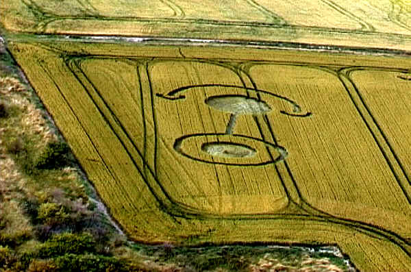 early nineties. Click on thumbnails to enlarge Image Stuart Dike Copyright 2001 Knoll Down, is a small copse of trees, situated high above the Gallops, only a quarter of a mile from Beckhampton, but it is a place of fascination for many people who visit the Avebury area. The trees I believe are shielding a place of strong Earth energies, as there have been many dowsers who have confirmed it is a Ley centre. Many people seem to be drawn to this particular place, but this year there is another reason why this location is so special. Placed in the Wheat field directly below the trees, but slightly further along towards the Wessex Ridgeway, is a wonderful small Dumbbell, with many characteristics of similar shapes from the 1990 and 1991 seasons. “These historical shapes are in a way telling us that they do not need to have a prominent position within the landscape” Many people can probably remember my enthusiastic reporting on another exquisite Dumbbell back in 2000, along the Avebury Avenue. This latest design is very similar, and equally as dramatic in location, but both of them shared a common link, which I feel is very important in understanding the phenomenon. These historical shapes, are in a way telling us that they do not need to have a prominent position within the landscape, in view of everybody. Their elusive, remote locations are to signify that the smaller, less exotic shapes are just as powerful as their larger cousins on the hillsides around the immediate area. But their quieter positions in the landscape are also connected to the whole experience, giving the viewer a greater understanding of the message they are conveying to us. It really is quite breathtaking