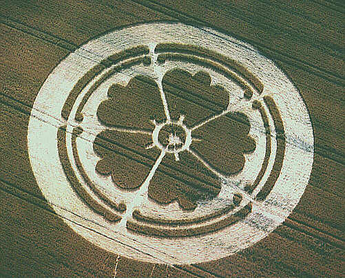 One of the many aspects of crop circling, is debating on the possible meaning or interpretation of the designs, as they appear. The 2001 season, has seen a mixture of such wonderful patterns, but the others have incorporated into the shape, similarities to well known emblems, symbols etc. This latest shape at Beckhampton, had quite an unmistakable likeness to the Tudor Rose. When Henry VII was made king, uniting both York and Lancaster, he chose as his emblem a made-up symbol of a white and red rose. It wasn’t until the reign of Henry VIII that he decided to represent these combined roses as an emblem for his beloved England. But what are the combined roses exactly? Well, the House of Lancaster was a traditional red rose, supposedly the Gallica Officinalis, while York has a white rose, the Alba semi-plena.