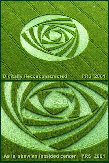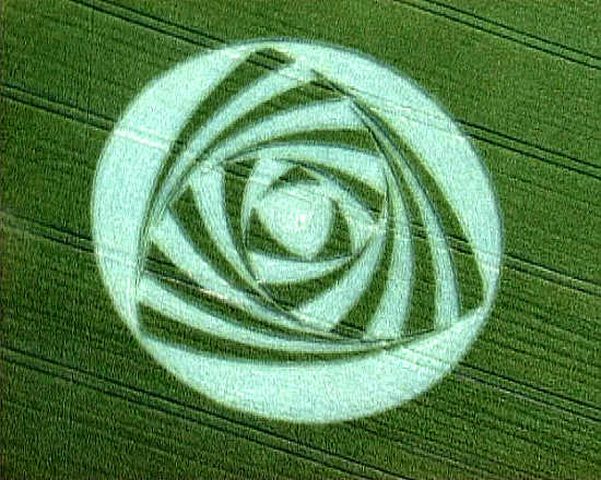 BARLEY WONDER SPARKS THE SEASON! The range of hills and flats north of Avebury, is certainly a contrast in crop variety to the rest of the surrounding countryside. This particular part of the Avebury landscape, has a number of villages running along the A4361, which runs towards Swindon. The second village outside of Avebury is a small place known as Berwick Bassett, which has seen a few formations in the past, but this latest design, ranks as one of the finest along this stretch of road. As we are all aware the season has been very slow in coming this year, but this latest event, is I am sure the start of the 2001 season in Wiltshire. Many people we have spoken to have already also felt the same, and with it, hopefully we will witness a more relaxed view from the Farmers. Time will tell! This design, has certainly echoes of past formations, not only from last year’s season, but also from this year already. Situated just off the double bend on the A4361 and on the flat facing Rough Hill, is a wonderfully constructed formation, just of the Bridleway, which runs past Avebury itself, and eventually joins the Ridgeway. It is located about 100ft into the field, and is in green immature Barley, just over waist height. This design, has certainly echoes of past formations, not only from last year’s season, but also from this year already. We can see a pattern starting to emerge with regard to a particular part of its geometry, incorporated into at least two other formations. Full image in the Crop Circle archives The Allington Down formation from 2000, was the first design to use the Convex Equilateral Triangle. (Pursuit Curves) |