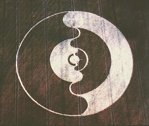 itself” The Crop Circle Connector took a flight on Sunday 15th of July 2001 and to our amazement, it was a major design with masterful execution. This was a real surprise, and I certainly couldn’t wait to get down and tell everybody. The design is not symmetrical, but this was deliberate, as you can see one side of the shape is not the same, which is part of the interlocking of one side of the formation. Click on thumbnails to enlarge Image Stuart Dike Copyright 2001 The central part of the formation with the inner circle and surrounding crescent, reminds us of the Bishop Cannings formation in 2000, it has the same characteristics, and indeed people once again are drawn to the centre, than any other part of the design. This is very interesting, and |