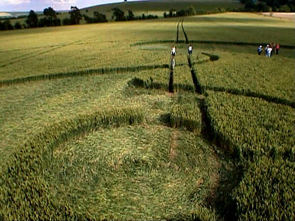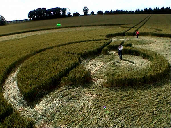 subtle, nothing too over powering. Click on thumbnails to enlarge Image Stuart Dike Copyright 2001 The floor pattern was also very impressive, and as you can see from the aerial shots, there are small bands of channels running around the large area of crop on the large outer ring segment. This is certainly part of the transition process of the Circlemakers, but it was also visible in the inner section of the design, around the inner circle. The overall diameter was 280ft across, which is very unworldly when you look across from one side to another. But this field was extremely flat, rising slightly perhaps from Windmill Hill, but it was a delight to see everyone enjoying them-selves once again, as this has been a frustrating season because of the restrictions forced on us. Now they are lifted, it is like a release valve has gone off, and we can now experience them, the way they should be. The Causeway Enclosure it certainly worthy for any formation, and I hope this is not the last time we see a crop circle on this side of the hill.