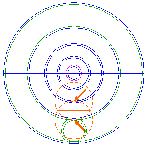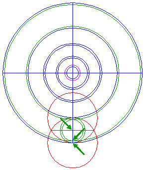 Construct a concentric pair of circles, centered at the intersection of the connecting line of step 12 and the vertical centerline, tangent to both pairs of circles (at the near sides). |