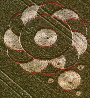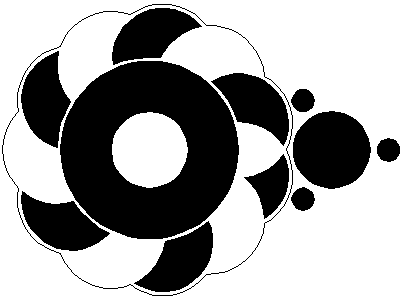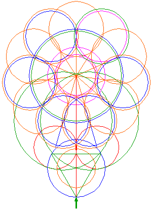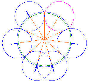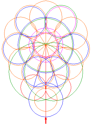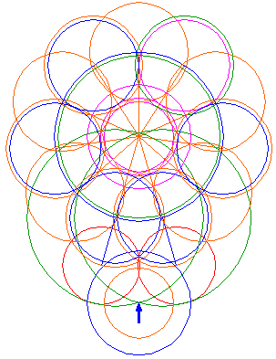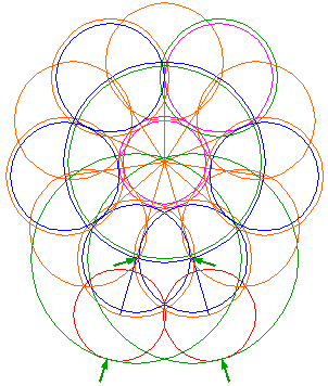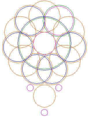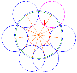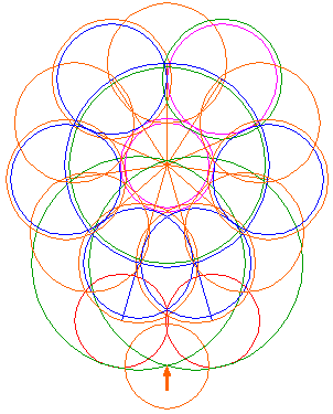 Copy circle 5 five times, to the end-points of every second ray, counted from the center of circle 5, three on the left, two on the right. Notice, that at the bottom two circles overlap. |