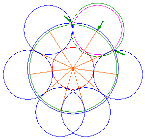 Construct a circle concentric to circle 5, passing through the closest intersections of the adjacent circles 6 and circle 1. |