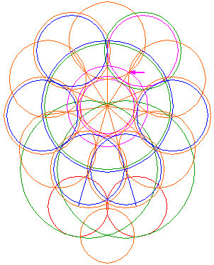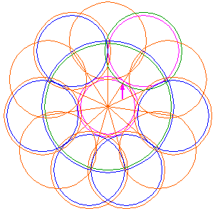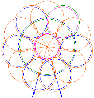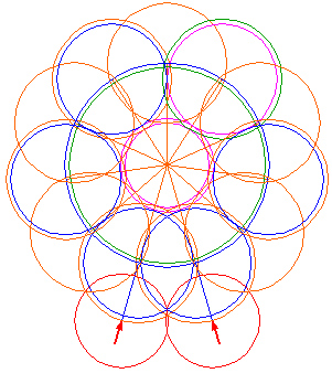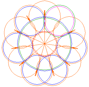 Copy circle 8 ten times to the end-points of all the other rays 4, eleven in total (circle 8 included). |