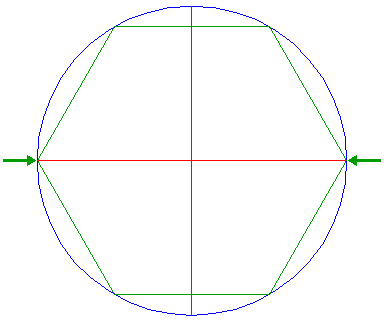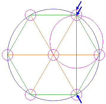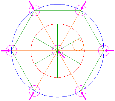 Construct a hexagon (regular 6-sided polygon), with angular points at the end-points of the horizontal centerline. |