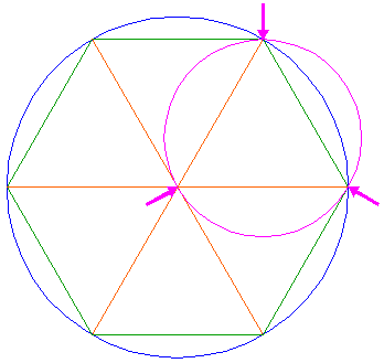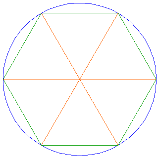 Draw the diagonals through the center. Together with the hexagon, these form six equilateral triangles. |