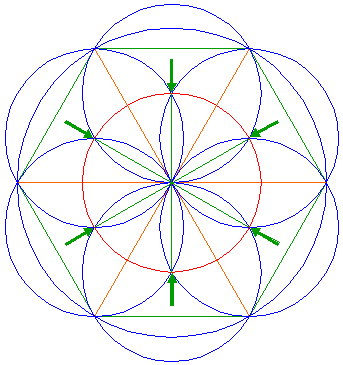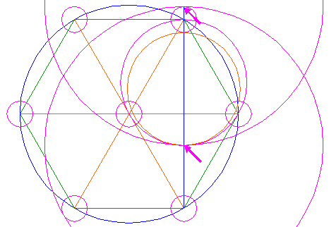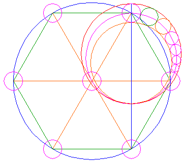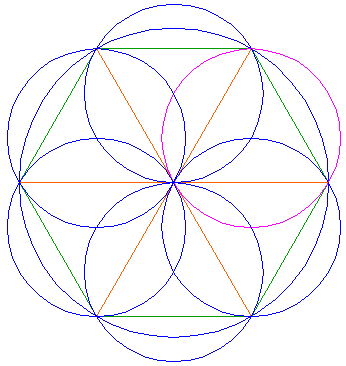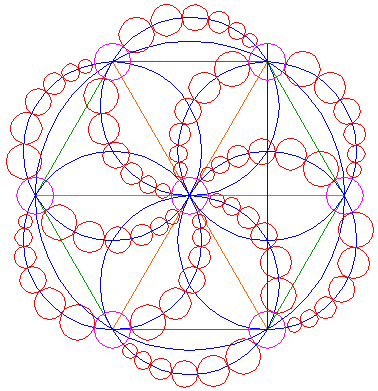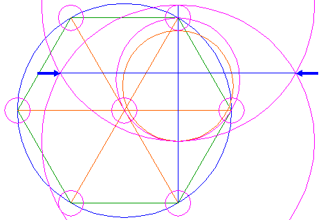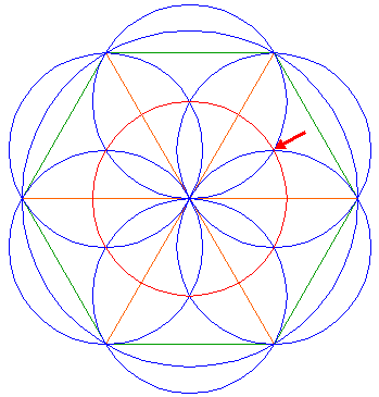 Copy this circle 7 times, one to the center of circle 1, and six to the angular points of hexagon 3. |