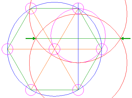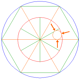 Draw the diagonal of hexagon 3 connecting the angular points on the right, above and below the horizontal centerline. Extend this line until it intersects the upper circle 10 on the right at the upper side, as shown. |