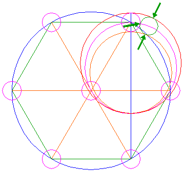 Construct a circle touching one of the connecting lines 8, the one just above the horizontal centerline on the right, touching the horizontal centerline itself, and touching circle 7 at the inner side, as shown. |