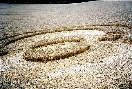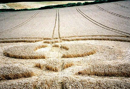 Image © Graham Tucker 2001 Kent's 4th formation is a beautifully etched figure of 8 lying on a gentle hill-side, close to the village of Shoreham. It's around a mile or so from Lullingstone Castle, and only a stone's throw from a hill-side cross, which was cut into the chalk as a local memorial to those lost during the First World War. This is the second occasion that one has appeared close to a chalk cross (Lenham, near Maidstone, Kent, on the same date in August, would you believe - Aug. 19th 1999!).