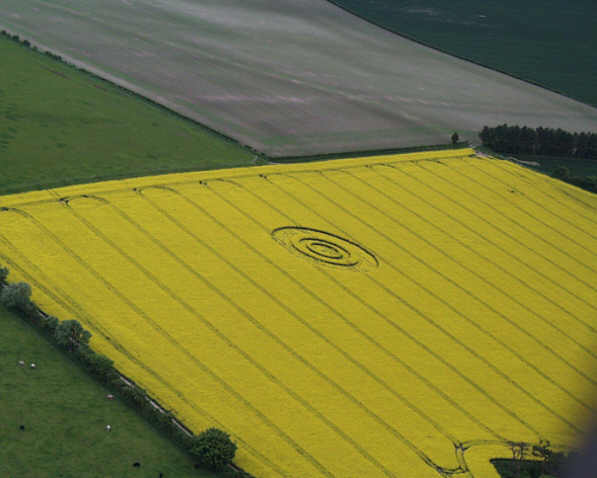 us it was an arrangement of circles and rings.. The last report on Monday, was from Peter Harrison, who gave us the most comprehensive report, with an actual description of its orientation to Old Winchester Hill. It is situated on the North East side of the hill, and is definitely in flowering Oil Seed Rape (Canola). So, we now know it is an actual event, with an arrangement of three circles, with possibly rings incorporated? We must inform anyone who is planning to go and see the first event, not to take for granted that the general public have access to this field. Lets not forget the Foot and Mouth situation is still with us, so we must all at responsibly. Further information we have been given, is that Old Winchester Hill is still closed, and there are Foot &Mouth signs everywhere. Hopefully the circle can be viewed from the road, which may be the only option at the moment. A full report will be online, before the end of next weekend. Report by Stuart Dike |
