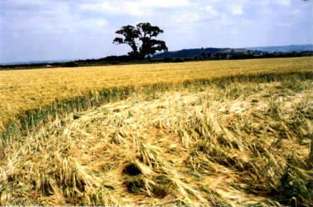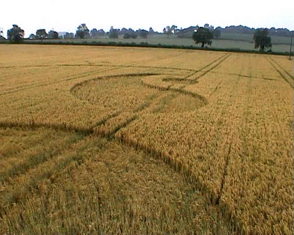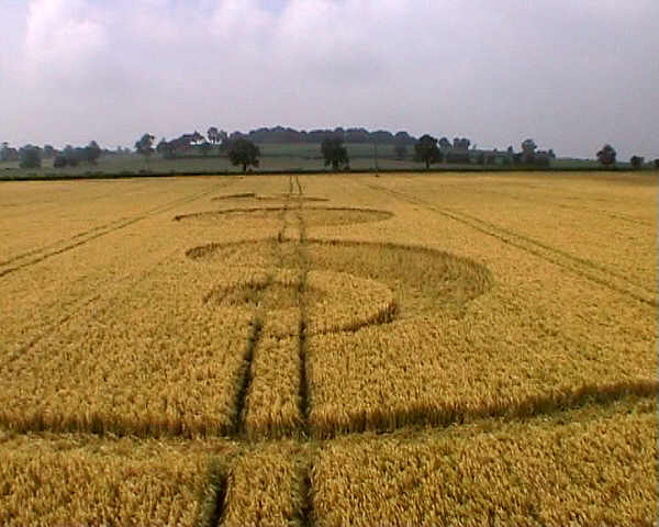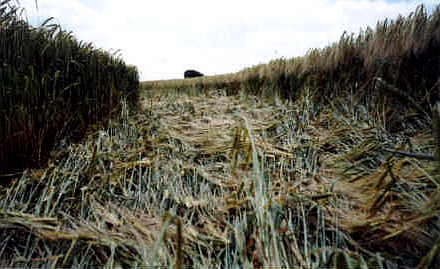 | Whidcombe brake is a small flat area of farmland, which is part of the Chelwood Parish estate, in between the small villages of Chelwood and Marksbury. It is an area well known to myself, as many of you know, I used to live very close to this area once. The immediate landscape around Marksbury, is now a hot spot for crop circle activity, but Whidcombe Brake was actually visited by the Circlemakers back in 1992, when we received a small ‘S’ shape design, on the slopes of Whidcombe, below its own woodland. This latest event, is positioned, on the very top, just before the road drops down into Chelwood, but its actual location in the field, is placed directly on a footpath, leading across the field. Well, I say this, but the Farmer has wrongly sown his crops across the path. Before I carry on any further, I must stress that there are no Foot and Mouth restrictions in this area, and the path is completely open to the public. | The flat plain of land around Marksbury makes