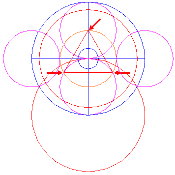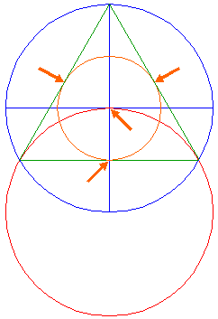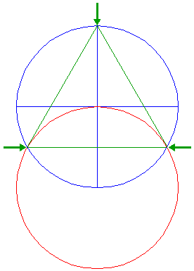 Notice that, since both circles are equal and pass through each other's center, they form the Vesica Pisces symbol. Therefore, both intersecting points together with the upper end of the vertical centerline form an equilateral triangle. Draw this triangle. |