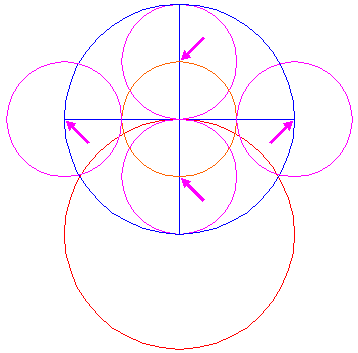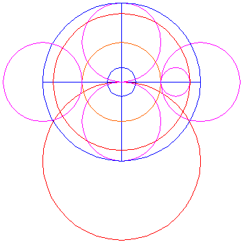 Copy this circle four times, to both ends of the horizontal centerline and to both intersections of circle 4 with the vertical centerline. |