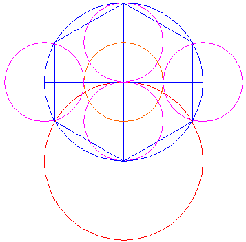 Construct the inscribed hexagon (regular 6-sided polygon) of circle 1, pointing up. |