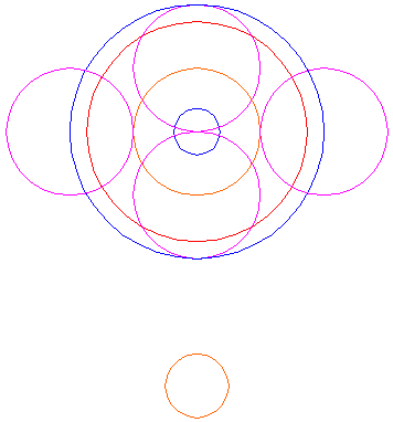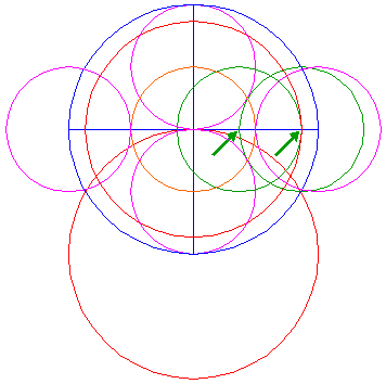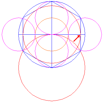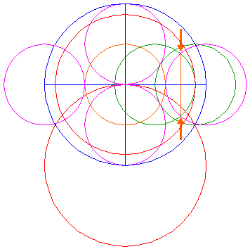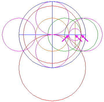 The next circle to construct is one that fits between circles 7 and 4. To do so, first, copy circle 4 two times, one to the intersection of the horizontal centerline with circle 7 (on the right), the other to the intersection with the circle just copied (on the left), see figure. |