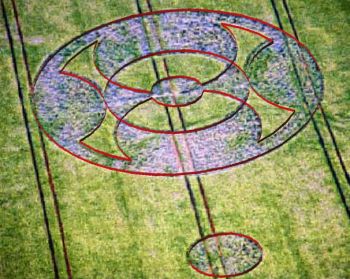 Deleting all parts of circles not used, and making black relevant areas, finishes the reconstruction of the 2001 Pegsdon formation. Black denotes flattened crop. |