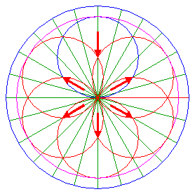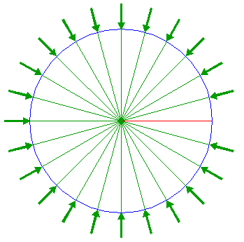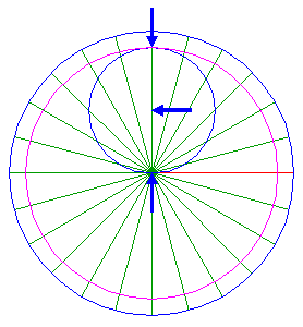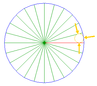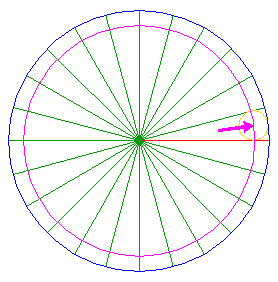 | 3. |   | Copy line 2 (ray nr. 0) 23 times (24 in total) and divide all rays evenly around circle 1. |