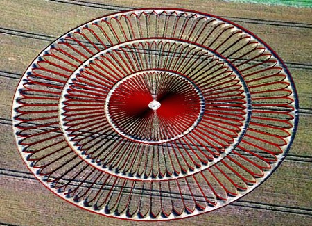 | 18. |   | Copy "islands" 17 75 times and distribute together with the originals (76 sets of three "islands" in total) evenly around the center of circle 1. The green areas correspond to standing crop. This finishes the reconstruction of The Gallops 2002 formation. |
