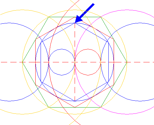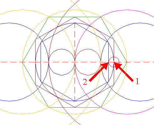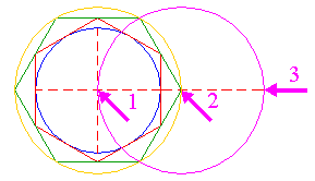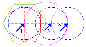 | Copy circle 4 from the center of circle 1 (1) to the rightmost point of hexagon 3 (2). Extend the horizontal centerline to the right up to the far side of this copied circle (3). | ||