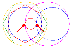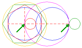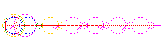 | Construct a circle with the end-points of its centerline coincident with the center of circle 1 and the left intersection of the last circle 6 and the horizontal centerline. | ||