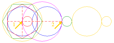 | Construct the circumscribed hexagon (regular 6-sided polygon) of circle 1, pointing up. | ||