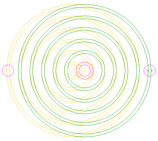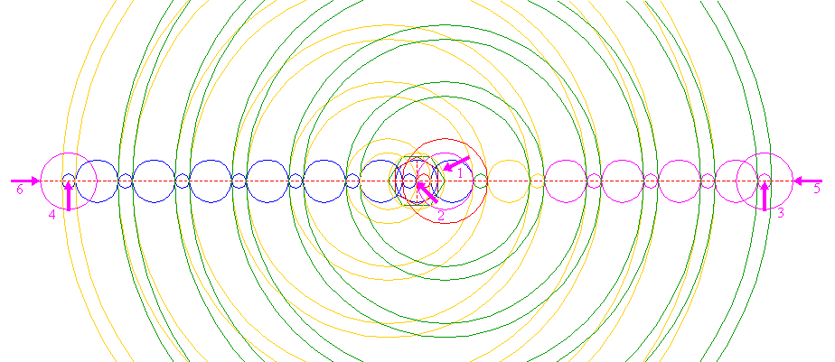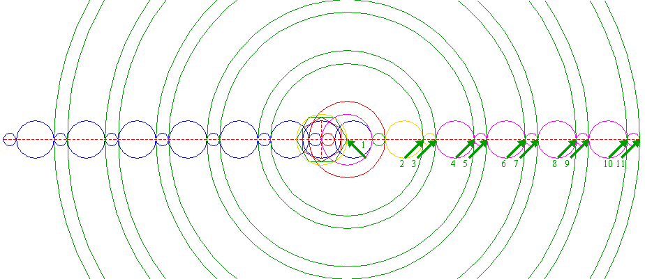 | Construct ten circles concentric to circle 5 (1), passing through all the left (2, 4, 6, 8 and 10) and right (3, 5, 7, 9 and 11) intersections of the smaller circles 9 and 10 and the horizontal centerline. | ||
