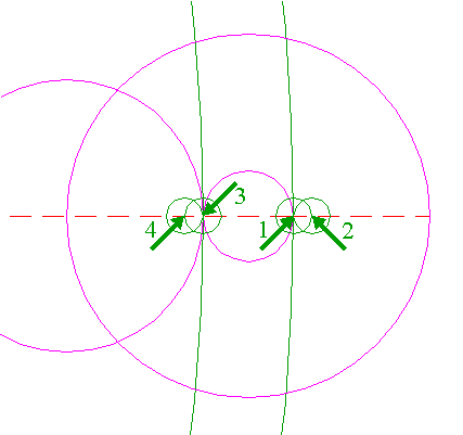 | Use again the center of circle 1 as a reference point (1) to copy circles 6 (second copy) and 8 to the intersection of both circles (2). | ||