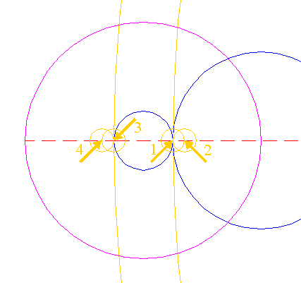 | Copy circle 1 from its center (1) to the end-point of the horizontal centerline on the right (2), and another one to the intersection of this copied circle and the same centerline (3). | ||