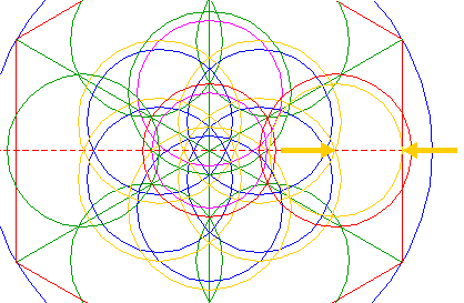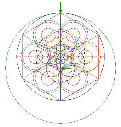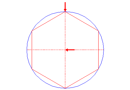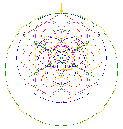| Construct the inscribed hexagon (regular 6-sided polygon) of circle 1, pointing up. |