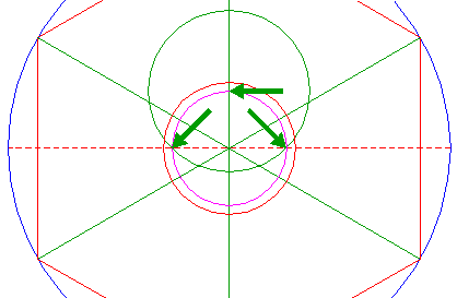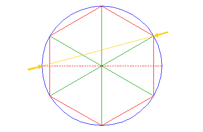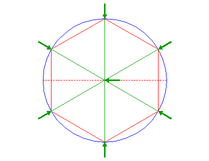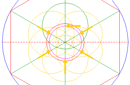 | Draw the six rays from the center of circle 1 to the angular points of hexagon 2. |