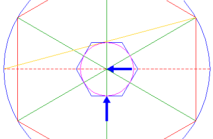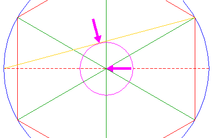 | Draw the connecting line between the left intersection of circle 1 with the horizontal centerline and the upper right angular point of hexagon 2. |