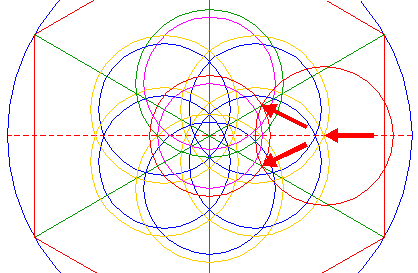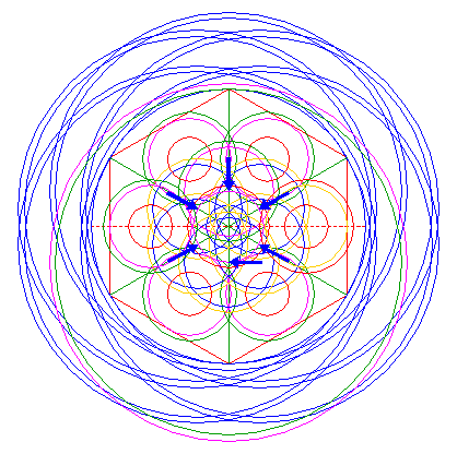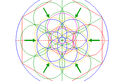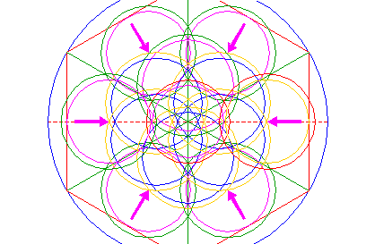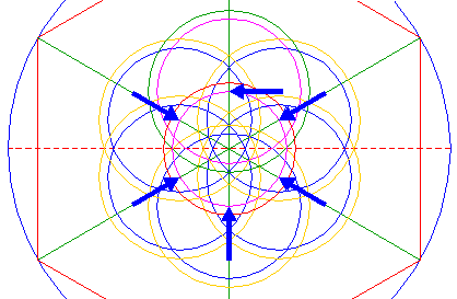 | Copy circle 12 five times, to the other corresponding mutual intersections of circles 8 and 9. |