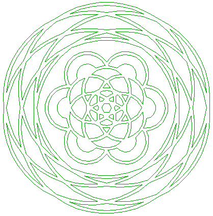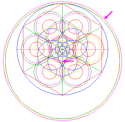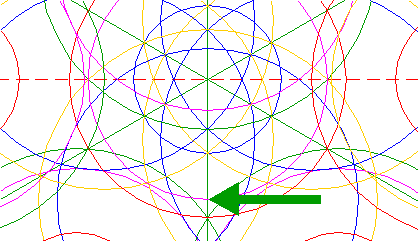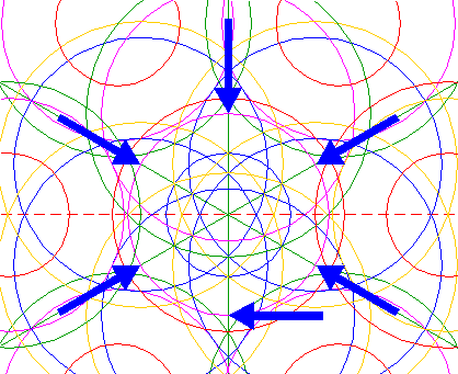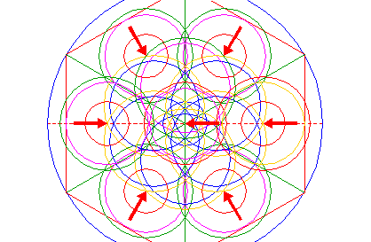 | Copy circles 18 and 20 five times, to the intersections of circle 5 and remaining rays 3 (see detail). |