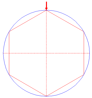 | Construct the inscribed hexagon (regular 6-sided polygon) of circle 1, pointing up. |