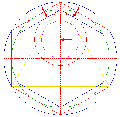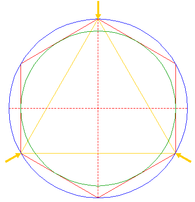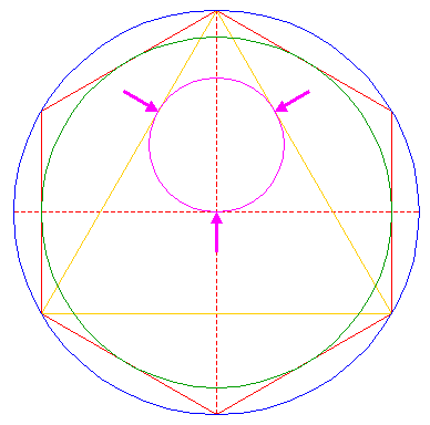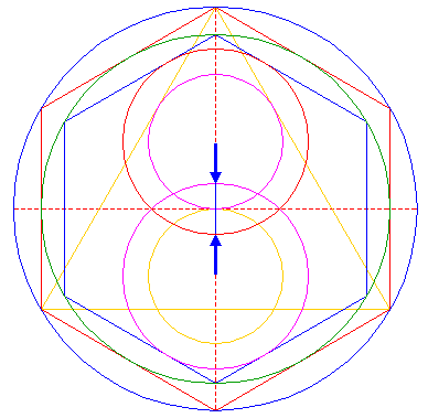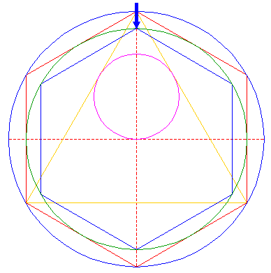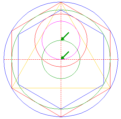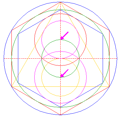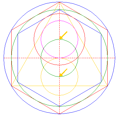| Construct the inscribed hexagon of circle 3, pointing up. |