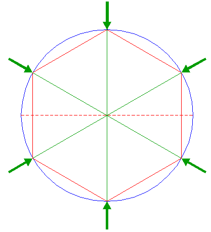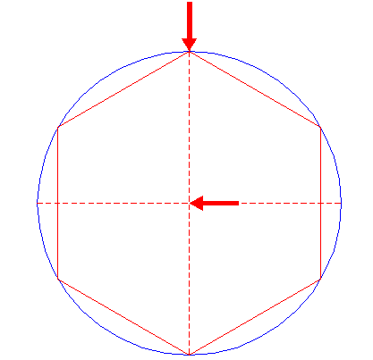| Construct a circle, with the rightmost side of hexagon 2 as its centerline (centered at the intersection of that side and the horizontal centerline, and passing through the two rightmost angular points of hexagon 2). |
