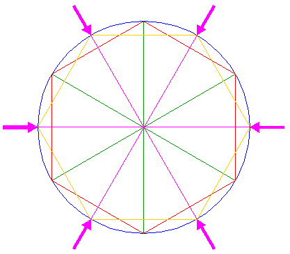 | Copy circles 15 six times, to the intersections of circle 10 and diagonals 5. |