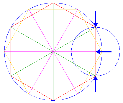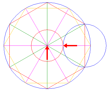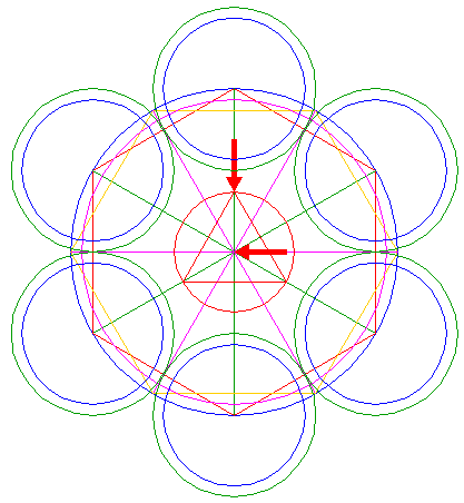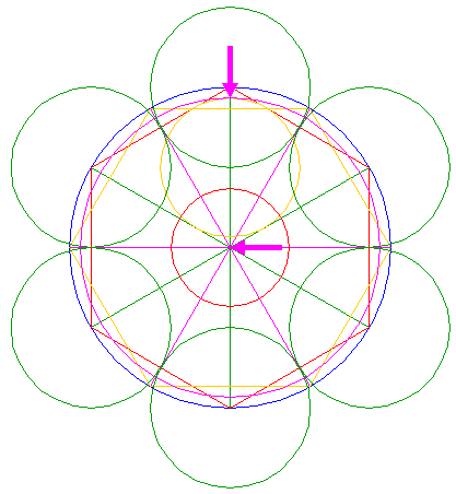 | Copy the set of three circles 8, 11 and 14, centered at the lower angular point of hexagon 2, to the center of circle 1. |