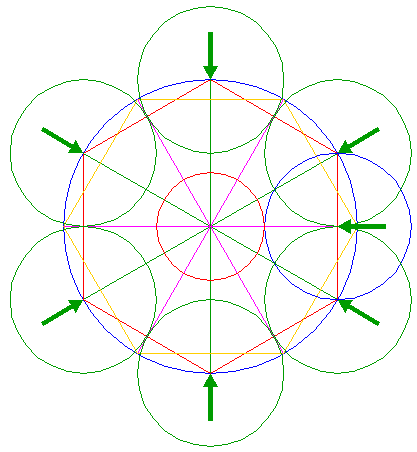 | Copy circles 15 twelve times, to the outer intersections of circles 8 and outer circles 16. |