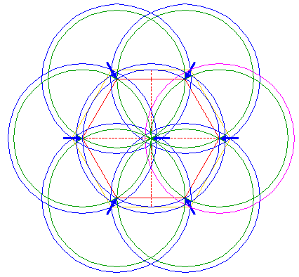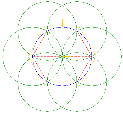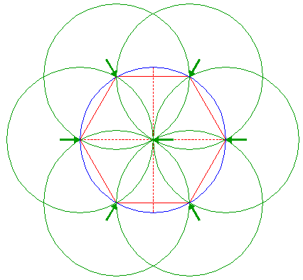 | Construct the inscribed hexagon (regular 6-sided polygon) of circle 1, pointing to the right. |