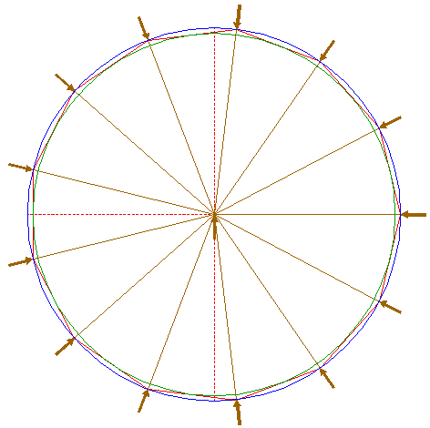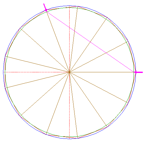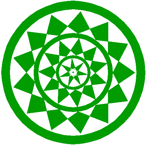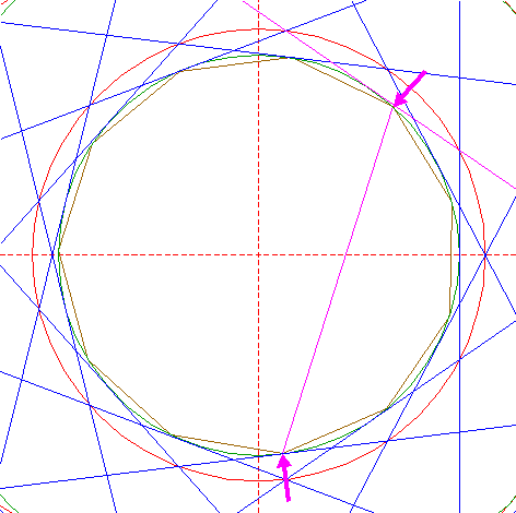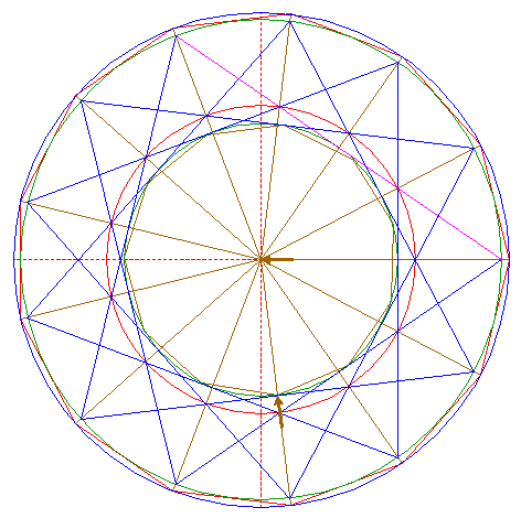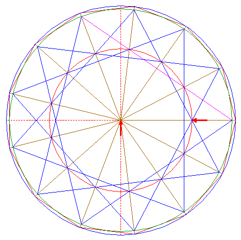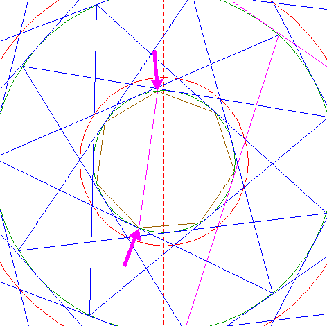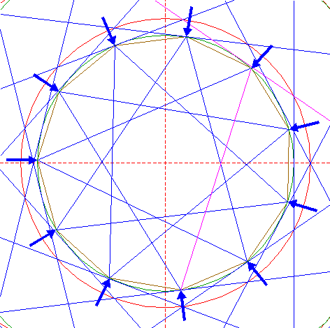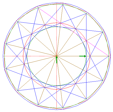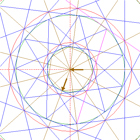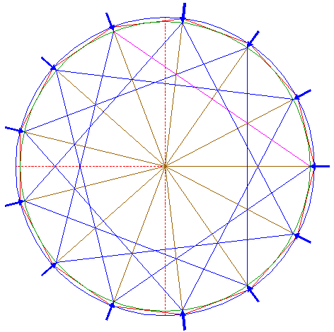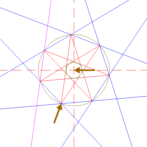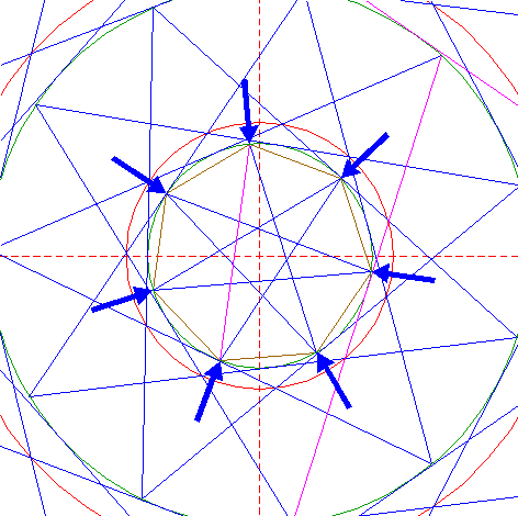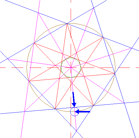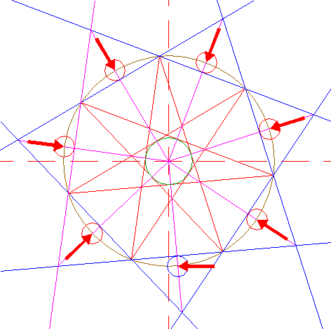 | 14. |   | Construct the inscribed heptagon (regular 7-sided polygon) of circle 13, with one angular point coincident with the intersection of circle 13 and the fifth ray 4, counted clockwise from the rightmost one (inclusive), as shown. Note, that all used regular polygons (13-, 11-, and 7-sided) can not be constructed exactly by the ruler-and-compass construction method. The best approximation is to calculate the co-ordinates of the angular points as accurately as needed. |